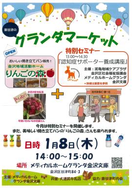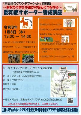 「グランダマーケット」開催のご案内です! 【日 時】 令和8年1月8日(木)14:00~15:00 【場 所】 メディカルホームグランダ金沢文庫(金沢区谷津町84-3) なお、今回は特別篇として「認知症サポーター養成講座」も開催します。 13:00~14:30で講座を実施しますので、終了後にグランダマーケットへお立ち寄りいただけます! ※講座への参加は事前申し込みとなっております。 詳細はチラシをご覧ください♪ 皆さまのご参加をお待ちしております!